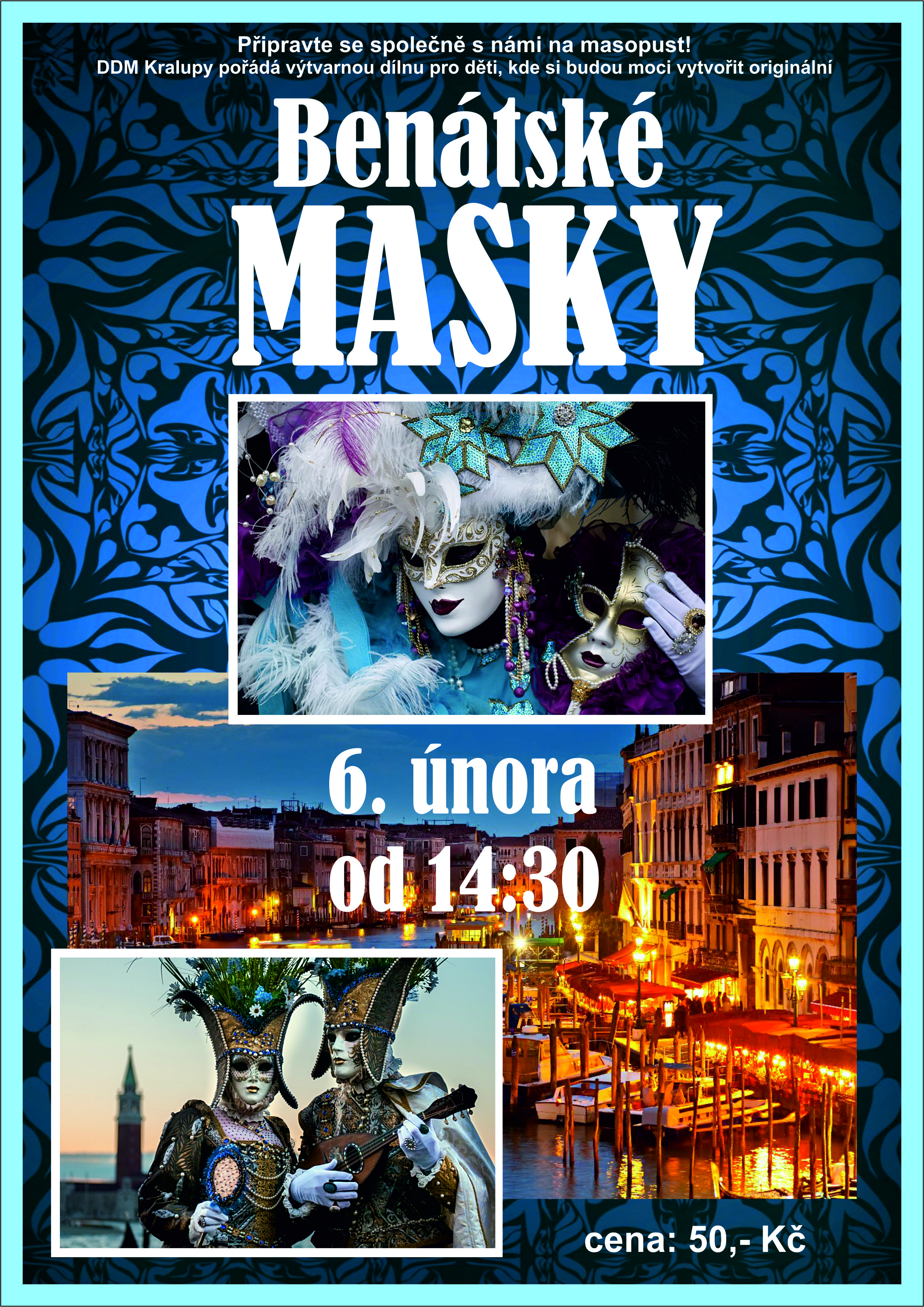 Připravte se společně s námi na masopust! V úterý 6. února jsme pro děti připravili tvůrčí dílnu BENÁTSKÉ MASKY, kde si budou moci vyrobit škrabošky v duchu italského karnevalu. Workshop začíná v 14:30. Těšíme se na vás a vaše krásné výtvory!