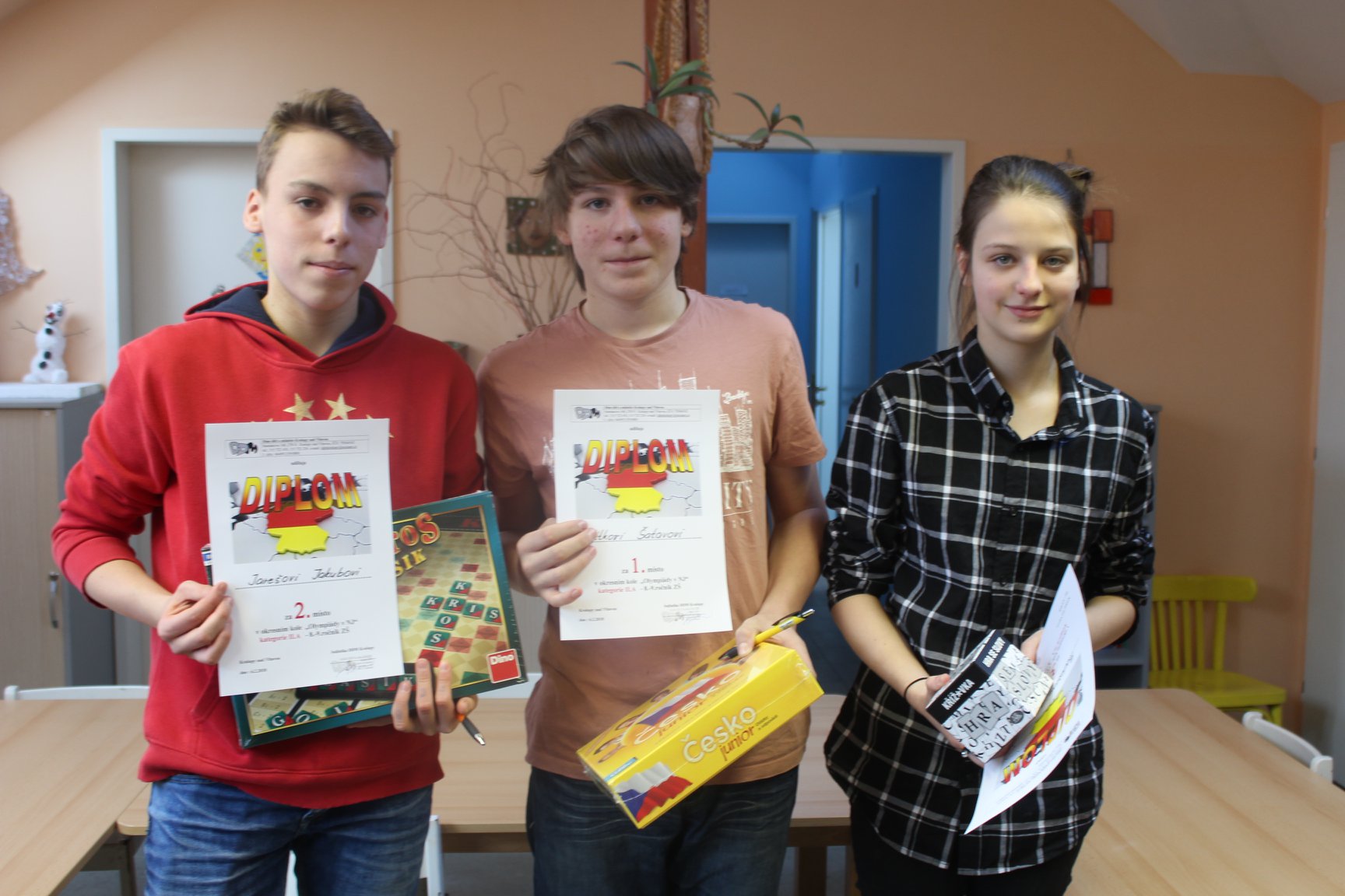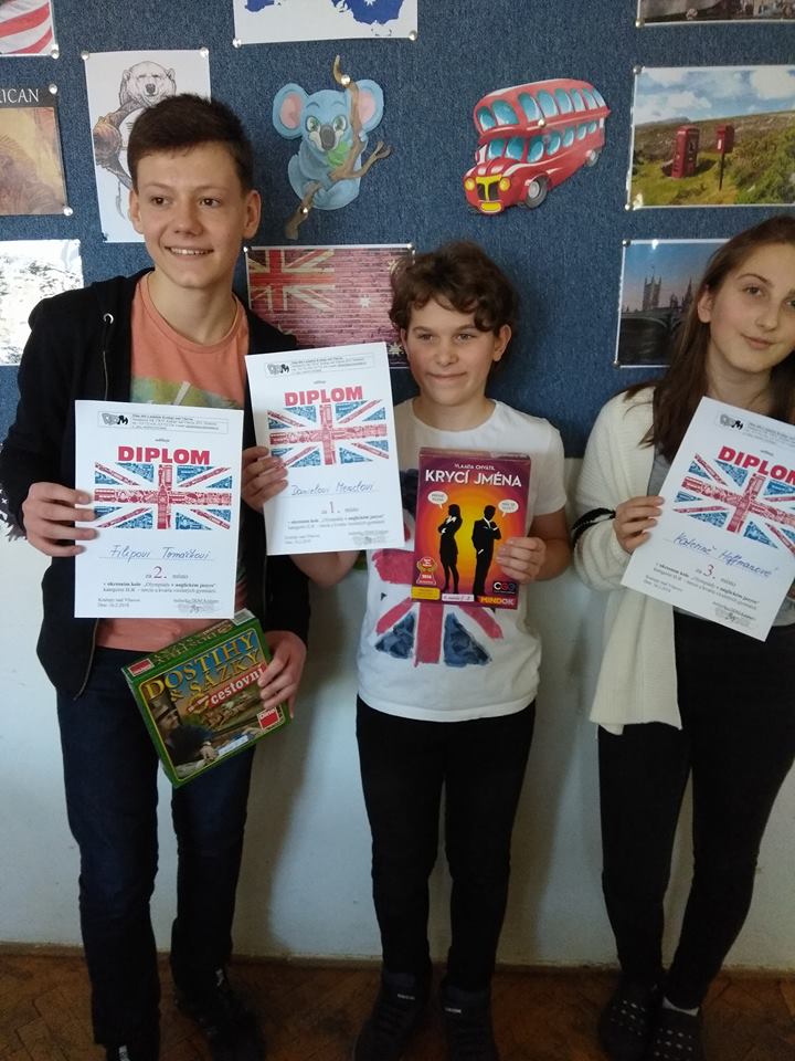 Anglický jazyk - kategorie II. B 1. místo: Daniel Mencl, 2. místo: Filip Tomášek, 3. místo: Kateřina Hofmannová